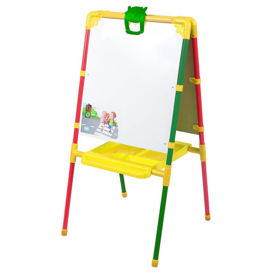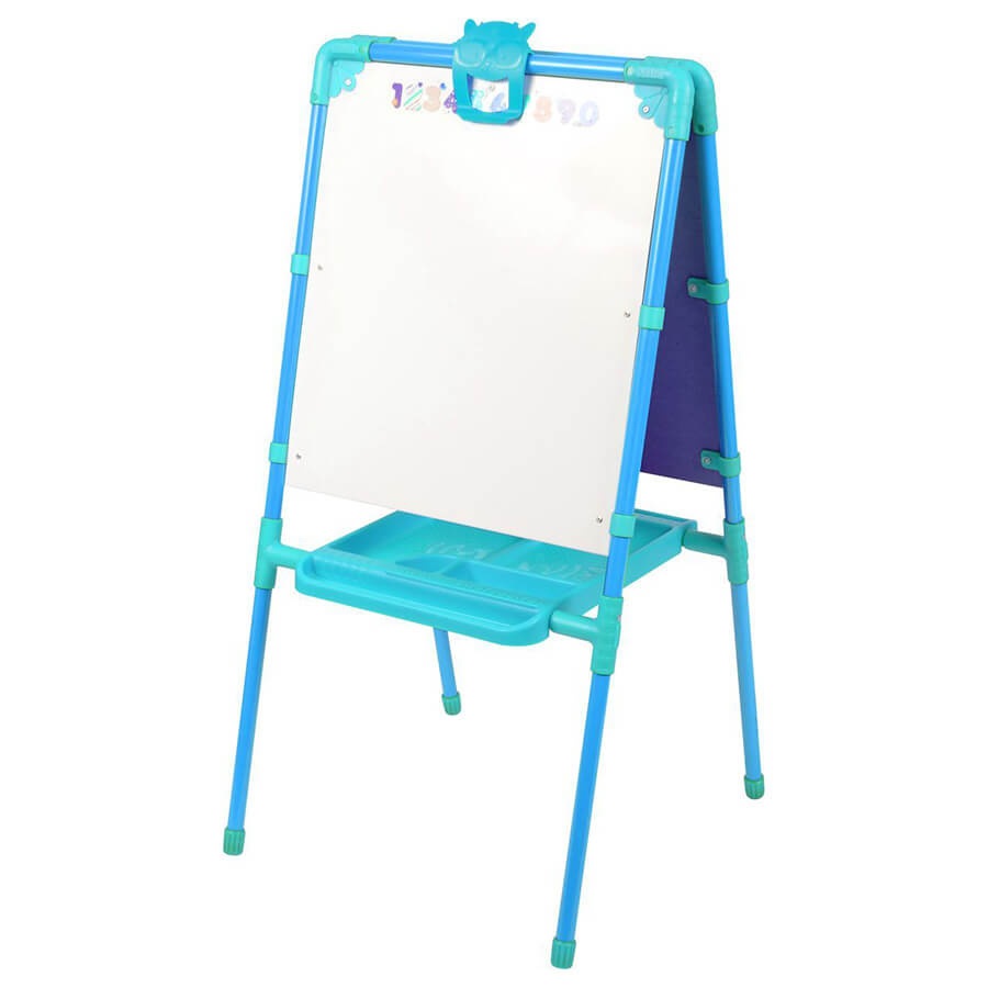 Такой мольберт включает в себя две рабочие поверхности – грифельную и металлическую. Качественные мольберты включают в комплект помимо основного предмета полочку и пенал. С таким двусторонним мольбертом ребенок может не только рисовать карандашами, фломастерами и красками, но так же сможет выучить цифры, буквы.