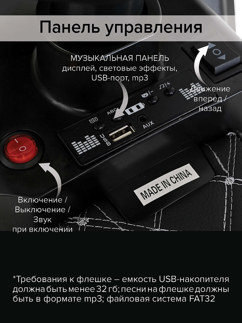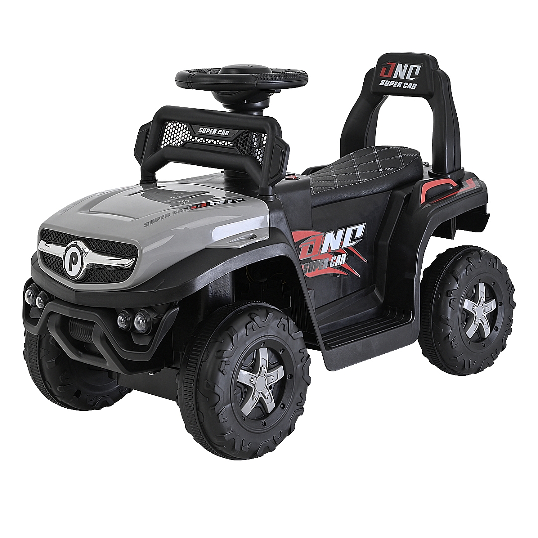В комплект входят: Аккумулятор: 6V4,5Ah – 1 шт., Мотор: 20W – 1 шт., Колеса: Пластик – 4 шт., Сиденье: Экокожа – 1 шт., Педаль газа на подножке – 1 шт., Зажигание: Кнопка – 1 шт, Корпус: Пластик- 1 шт., Спинка: Пластик – 1 шт., Руль: Пластик – 1 шт., Инструкция – 1 шт, Зарядное устройство – 1 шт.