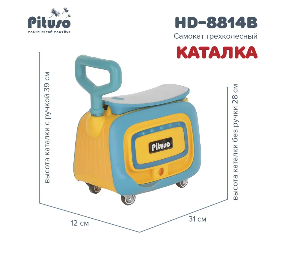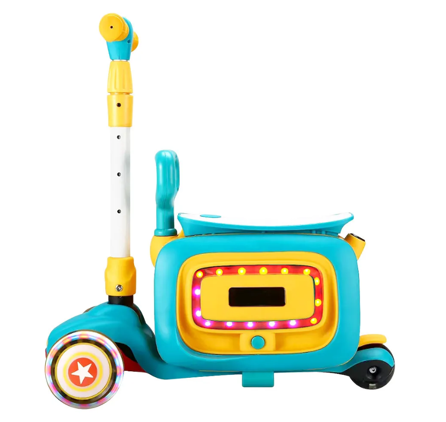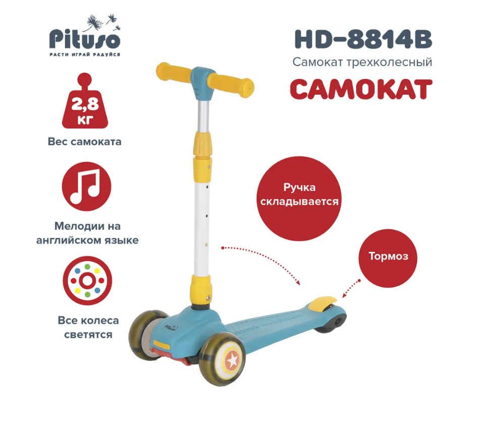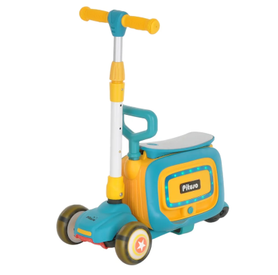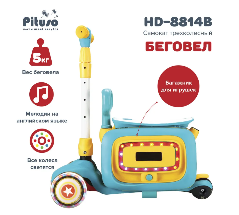 Самокат 3 в 1 ( самокат, беговел, каталка). Интересное решение от бренда Pituso сделают прогулки веселыми и интересными. Самокат состоит из двух частей, которые можно использовать как вместе с самокатом, так и без. Основные функции: 3-х колесный складной самокат, беговел и каталка. Самокат состоит из двух частей, вторая часть съемная и может использоваться отдельно, с помощью встроенных колес превращается в каталку. Под сиденье расположен удобный багажник куда ребенок может положить небольшие игрушки. Самокат оснащен различными мелодиями (на английском языке), колеса самоката светятся, а каталка имеет разноцветную подсветку.