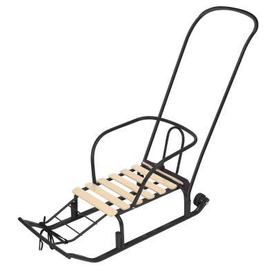 Санки комплектуются колесиками и съемным толкателем. Максимальная нагрузка — 25 кг.