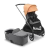 Корзина Bugaboo Dragonfly способна вместить до 10 кг груза, доступна с обеих сторон. В качестве дополнения имеется съёмная сумка, которая пристегивается сзади на каркас коляски и может быть присоединена к ручке в качестве органайзера. Шасси легко складывается вместе с установленным прогулочным блоком, вне зависимости от его расположения. Одно движение и коляска превращается в компактную сумку, которую можно переносить на плече за специальный ремень или катить за собой, словно чемодан.