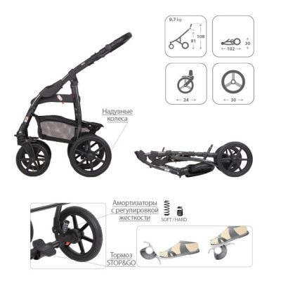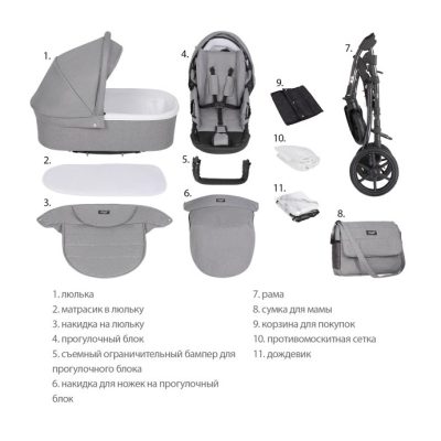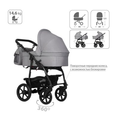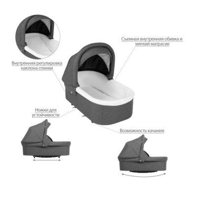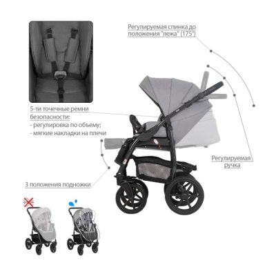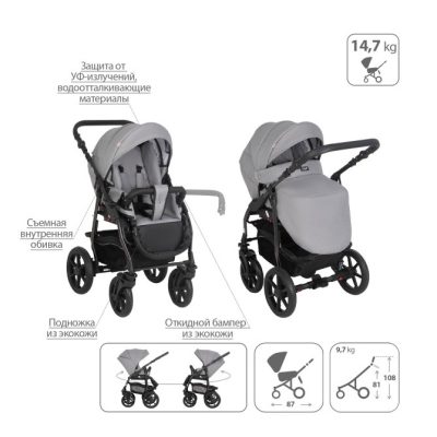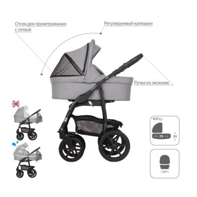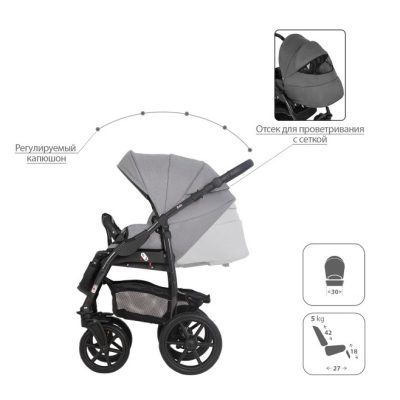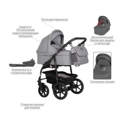 - Обивка коляски: водоотталкивающая, с УФ-защитой.