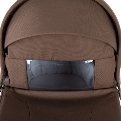 Капор люльки оборудован ручкой для переноски, имеется съемный козырек, дополнительная секция, климатическое окно под молнией в корпусе люльки и в капюшоне.