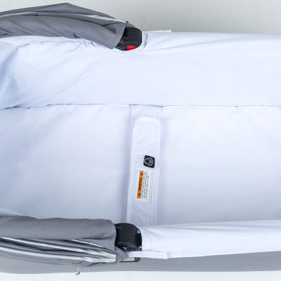 Трёхсекционный капор из непродуваемой ткани имеет вентилируемую секцию на молнии с антимоскитной сеткой. Плотная накидка на ножки пригодится в прохладные дни. Установить на шасси люльку для новорожденных External Bassinet не составит труда. Вставьте адаптеры в соответствующие разъемы на коляске и зафиксируйте перекладину из комплекта на раме. Обратите внимание, люльку можно устанавливать как на пустое шасси, так и на текстиль прогулочного блока. В сложенном виде спальный блок компактен, занимает минимум места.