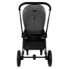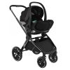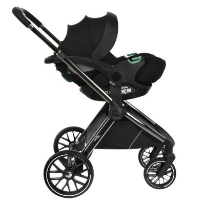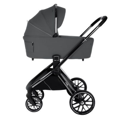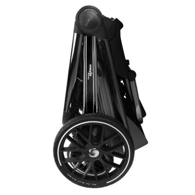 - Рама из облегченного алюминия с покрытием Black Chrome имеет повышенную износостойкость и компактно складывается по типу “книжки” вместе с прогулочным блоком.