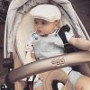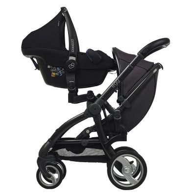 Сиденье имеет регулируемый откидной капюшон. Он имеет устойчивый каркас, который не позволяет ему складываться от сильного ветра. Спинка округлой формы наподобие гамака изменяет угол наклона при нажатии на основания с боков. Подножка настраивает свой уровень независимо от положения верхней части сиденья, поэтому ножки детей не затекают. В ней имеется отсек для хранения дождевика и встроенная снизу москитная сетка. Внутри каждого сиденья — пористый съемный вкладыш из дышащей гигиенической ткани с массажной поверхностью в области таза. Автоматический замок в форме яйца прочно сдерживает лямки встроенных ремней с накладками. Бампер с экокожей ограничивает движения малыша.