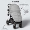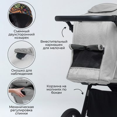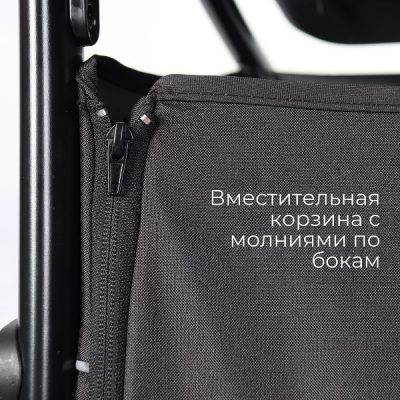 Здесь есть все: отстегиваемый ограничитель против сползания, пятиточечная система ремней с удобной регулировкой, съемный откидной поворотный бампер, световозвращающие полосы на капюшоне, подножке, корзине, чехле на ножки и даже на ремнях безопасности. Ну и, конечно же, ножной тормоз на задней колесной базе.