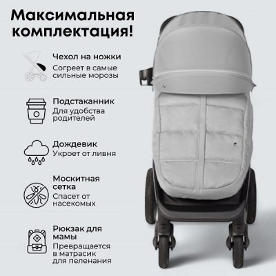 Кроме москитной сетки в комплекте есть дождевик, подстаканник, а также вместительная сумка-рюкзак, которая крепится на родительской ручке на удобных «ушках». Еще одна традиционная фишка BubaGO – рюкзачок превращается в плотный и удобный пеленальный матрасик.