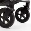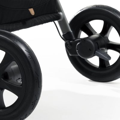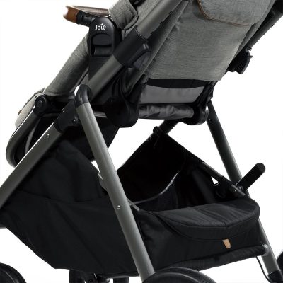 У Joie Aeria большая и вместительная корзина с хорошим доступом. Независимо от того, в каком положении находится блок и опущена ли спинка коляски, вы легко достанете оттуда даже объемные вещи, например, школьный рюкзак старшего ребенка. Для организации вещей в корзине предусмотрен разделитель. Особо важные предметы можно положить в отдельный большой карман. Тормоз расположен у правого колеса. Обратите внимание, что между задними колесами нет перемычки, а значит, вы не будете ее задевать при ходьбе. Большие псевдо-надувные колеса Joie Aeria поглощают мелкую вибрацию от дороги и хорошо проезжают разные препятствия. При езде по песку и снегу передние колеса можно заблокировать, чтобы повысить проходимость коляски.