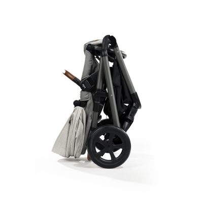 Ручка покрыта фирменной эко-кожей от компании Joie. Это плотный и мягкий материал, который хорошо показывает себя в эксплуатации, не лопается и не обдирается. Хват у ручки удобный. Она телескопически регулируется и легко подстроится под родителей любого роста. Коляска достаточно компактно складывается. Просто потяните за рычаги по обеим сторонам ручки и опустите её вниз. Затем нужно опустить подножку на прогулочном блоке. В сложенном виде коляска стоит самостоятельно и занимает немного места. По центру ручки предусмотрена специальная пластиковая деталь, на которую будет опираться коляска, когда вы её сложите.