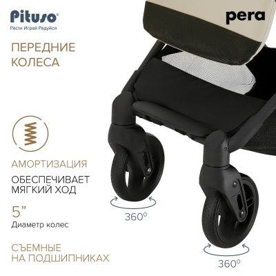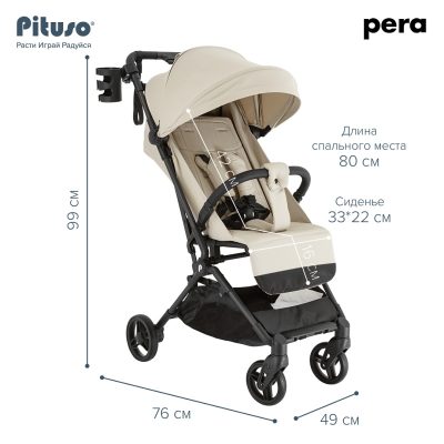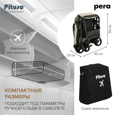 Cтильная, маневренная и легкая (5.7 кг) прогулочная коляска PITUSO PERA идеально подходит не только для прогулок, но и путешествий. Складываясь до очень компактных размеров, коляска подходит под параметры ручной клади в самолете.