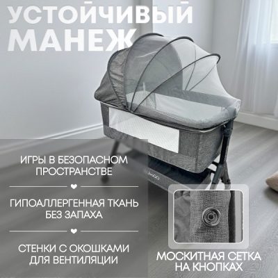 - Сетчатые окошки (60×15 см) обеспечивают вентиляцию и позволяют родителям легко наблюдать за малышом.