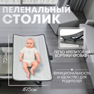 - Пеленальный столик крепится прямо на бортики кроватки, создавая удобное рабочее место для ухода за ребёнком.