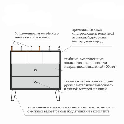 Ножки комода выполнены из массива сосны и покрыты безопасным лаком. В комплекте к ножкам есть мягкие фетровые подпятники, для защиты пола.