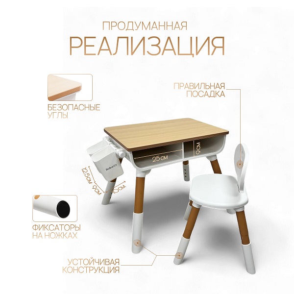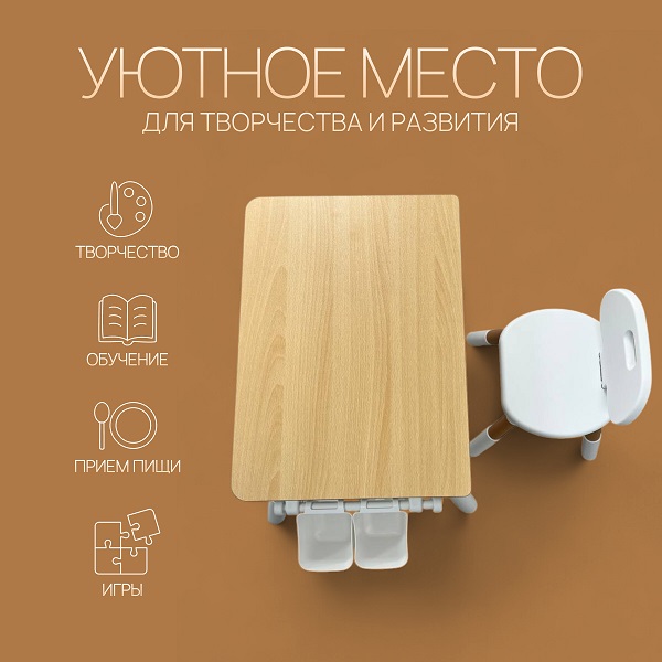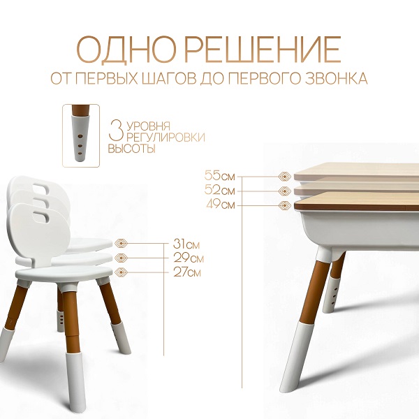 Регулируемая высота стола (49–55 см) и высота сиденья стула (27–31 см) позволяет подстраивать мебель под рост ребёнка — от первого года жизни до школьного возраста.