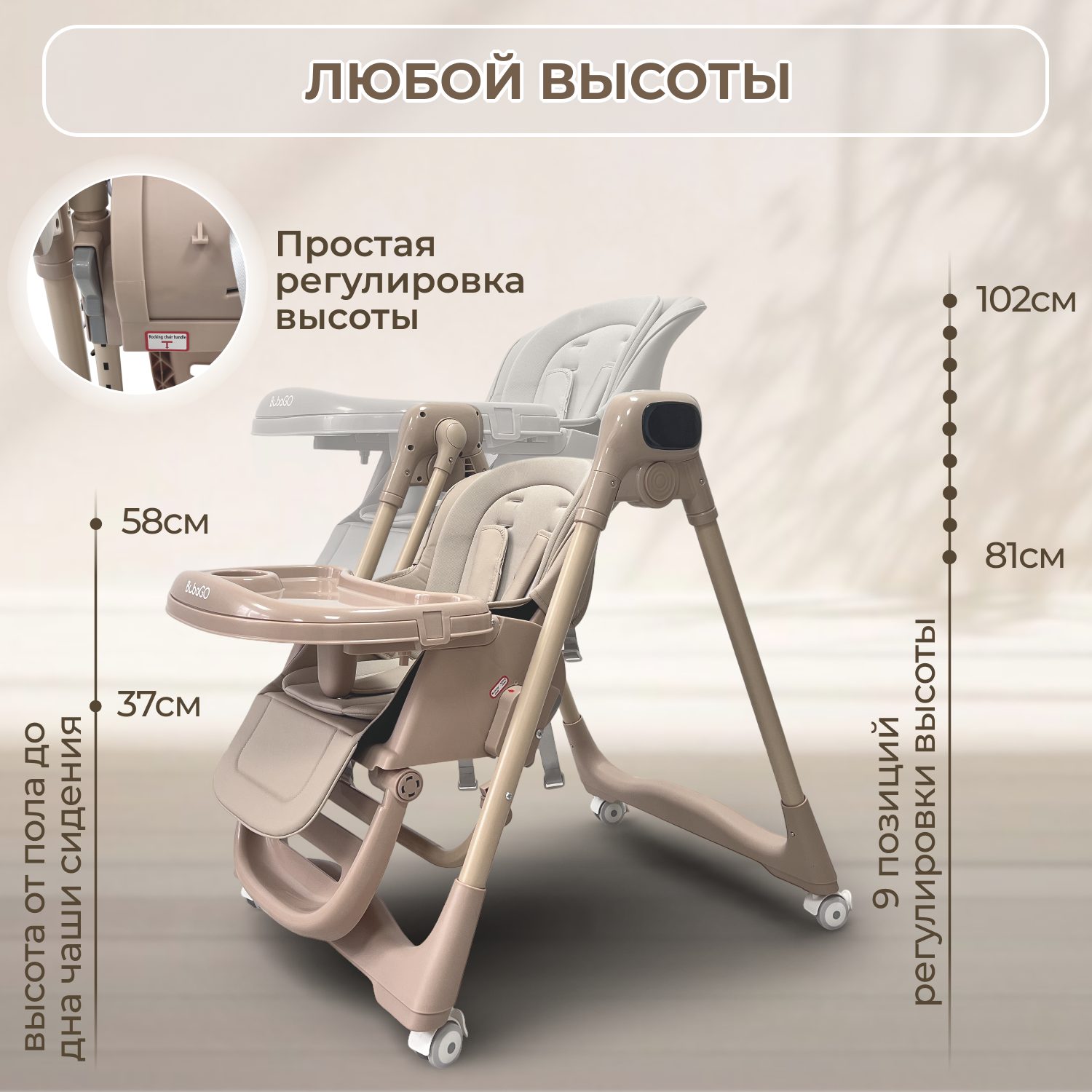 - 9 уровней регулировки по высоте— подходит под любой обеденный стол