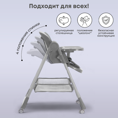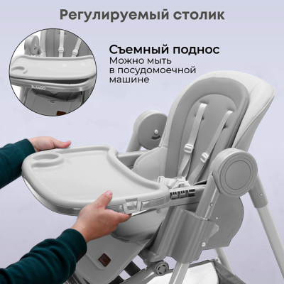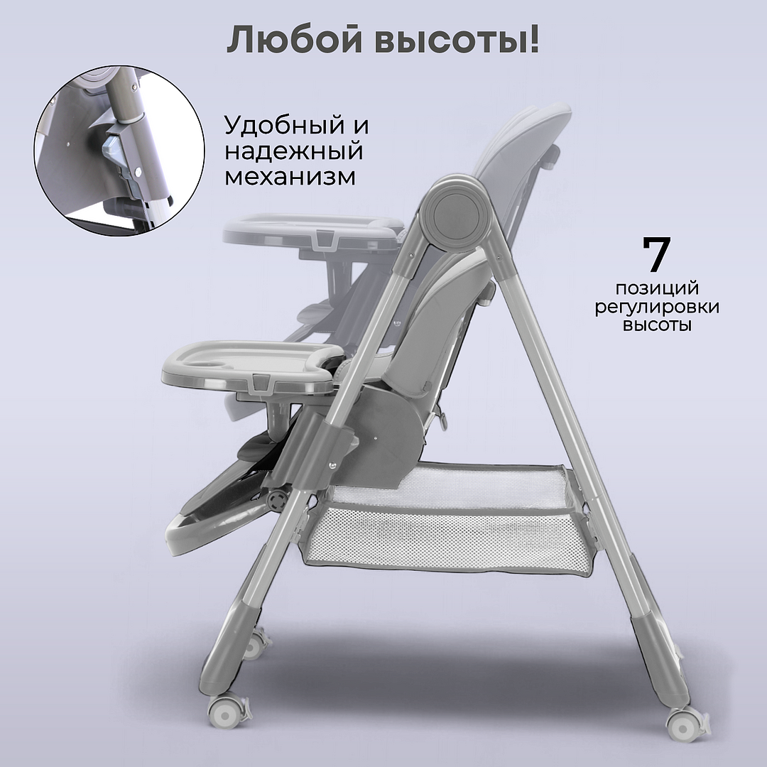Регулируемое положение: спинка и подножка стульчика регулируются в комфортных для вас 6-ти положениях, что позволяет ребенку расположиться в удобном полулежащем положении. Стульчик имеет 7-мь уровней высоты, чтобы вы могли подобрать удобную высоту для кормления или игр. Подлокотники поднимаются, чтобы стульчик можно было подвинуть ближе к вашему обеденному столу.