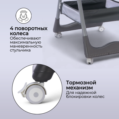Мобильность: съемные прорезиненные колеса со стопорами облегчают перемещение на дому, и их можно снять, оставив стульчик устойчивым на ножках с специальными вставками. Благодаря прорезиненному слою, колесики перемещают стул бесшумно, не оставляя следов и не царапая поверхность пола.