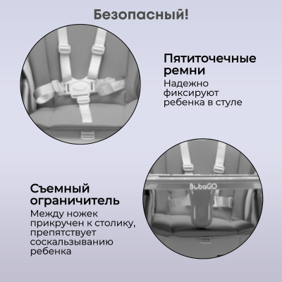Безопасность: для защиты малыша от падений и сползания в стульчике предусмотрены пятиточечные ремни безопасности и съемный ограничитель между ножек.