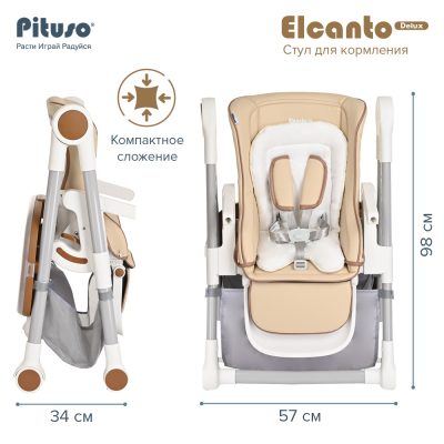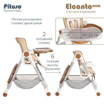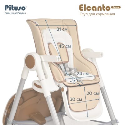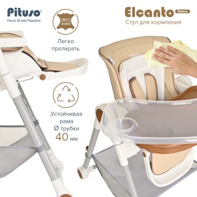 PITUSO ELCANTO DELUX cовременный стульчик для кормления ребенка с 6 месяцев до 3 лет. Растем вместе с малышом – регулируем высоту, подставку для ног и съемный столик. Обивка чехла из эко-кожи проста в уходе и удобна для ребенка. Мягкая вкладка создаст комфорт малышам помладше. Алюминиевая рама обеспечит легкость, прочность и устойчивость, а колесики на задних ножках придают стульчику мобильность. Съемные внутренние пятиточечные страховочные ремни обеспечат полную безопасность Вашему малышу. Стульчик легко и компактно складывается.